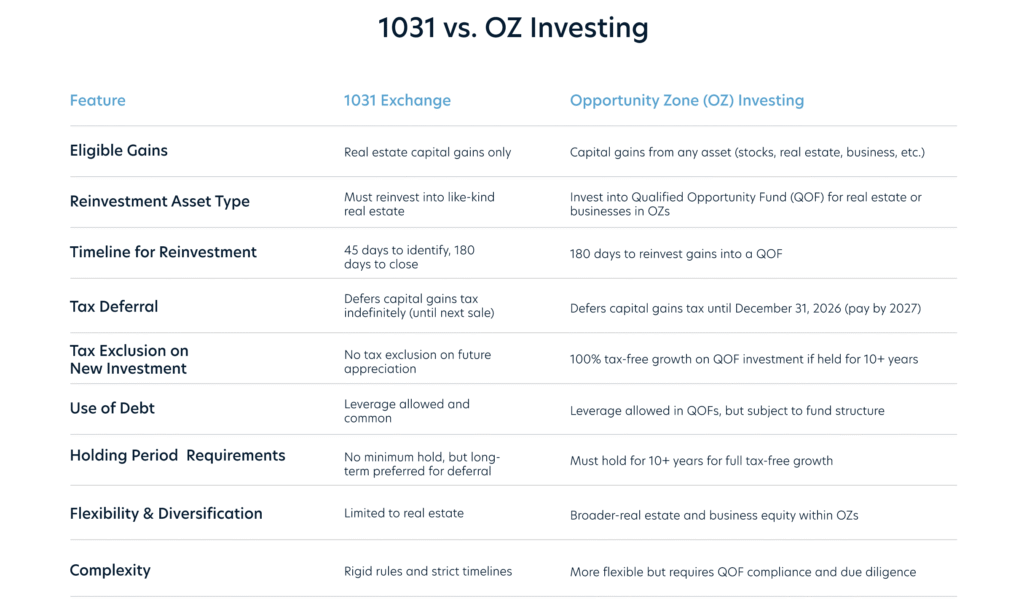 A 1031 exchange allows real estate investors to defer capital gains taxes by reinvesting proceeds into a like-kind property, but it must be real estate-for-real estate and follow strict timelines and rules. In contrast, Opportunity Zone investing offers more flexibility, as investors can roll over capital gains from the sale of any asset—not just real estate—into a Qualified Opportunity Fund (QOF), which can invest in real estate or businesses within designated Opportunity Zones.